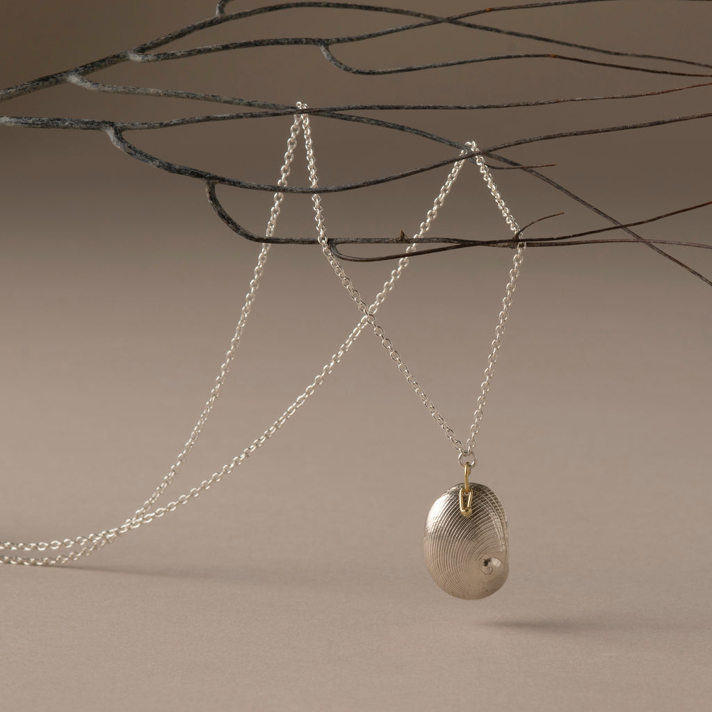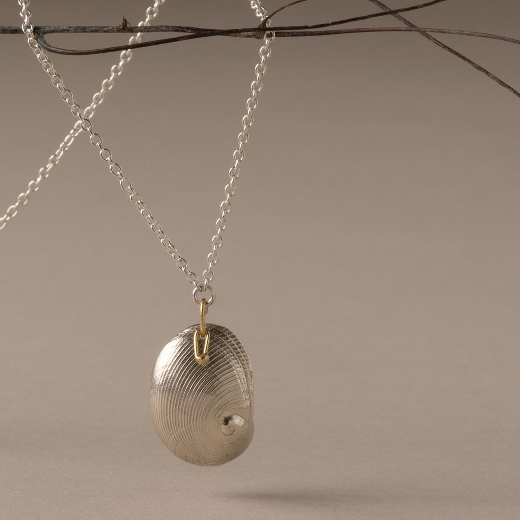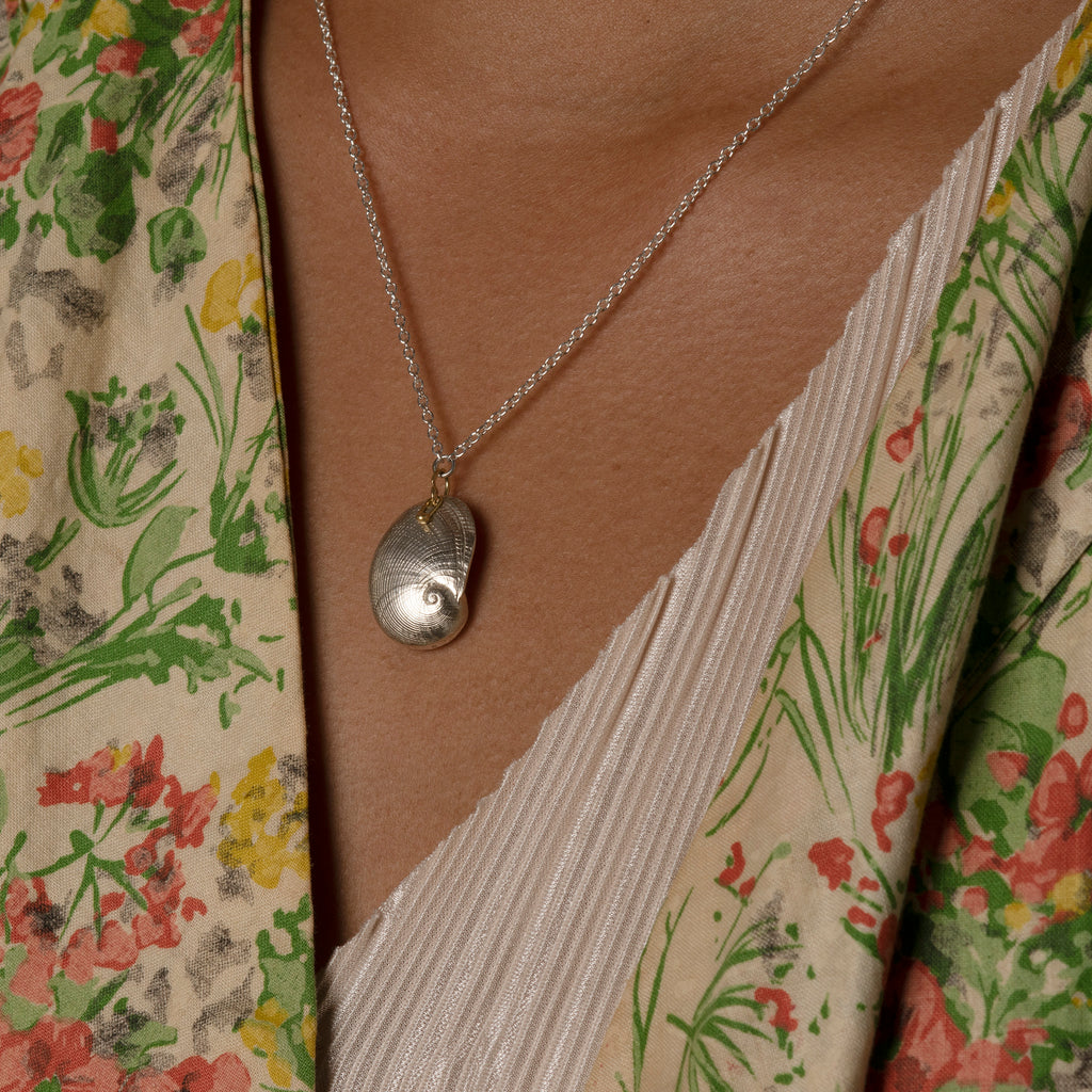 This necklace is made in Silver with 18K Yellow Gold accents. The Baby Ear Shell Necklace is made to order, please allow 2-3 weeks for the designer to make this for you.