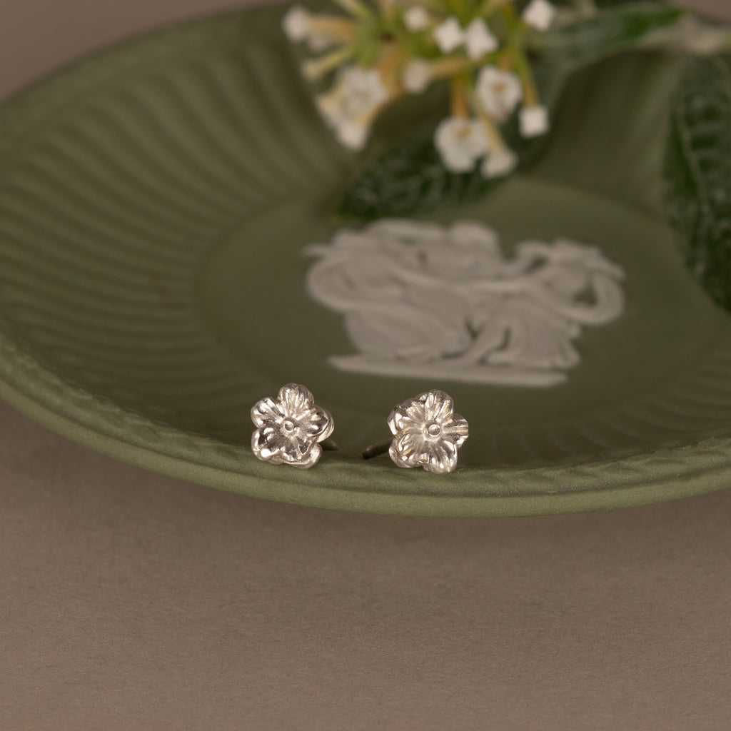 Hand-cast Flower, approximate size 6x6mm with post and ear backs. Available as pairs or singles in Bright Silver, 14K Yellow and Rose Gold.