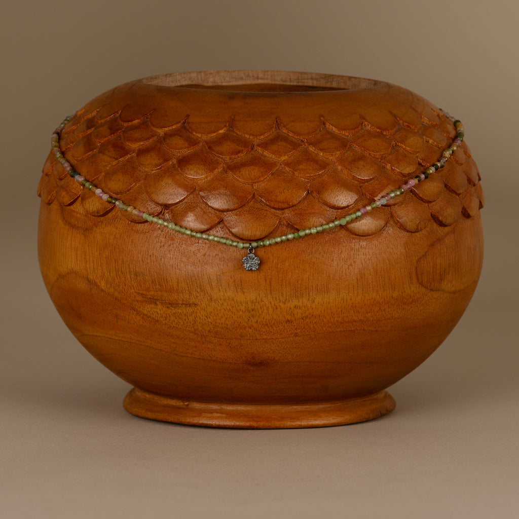 Hand-cast flower with gemstone beaded necklace. Horse size approximately 6x6mm. Beads paired with the charm are Nephrite & Rainbow Tourmaline. Length 17" with hand-forged simple S-shaped clasp with Coral Bead.