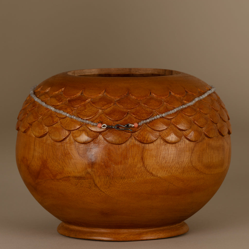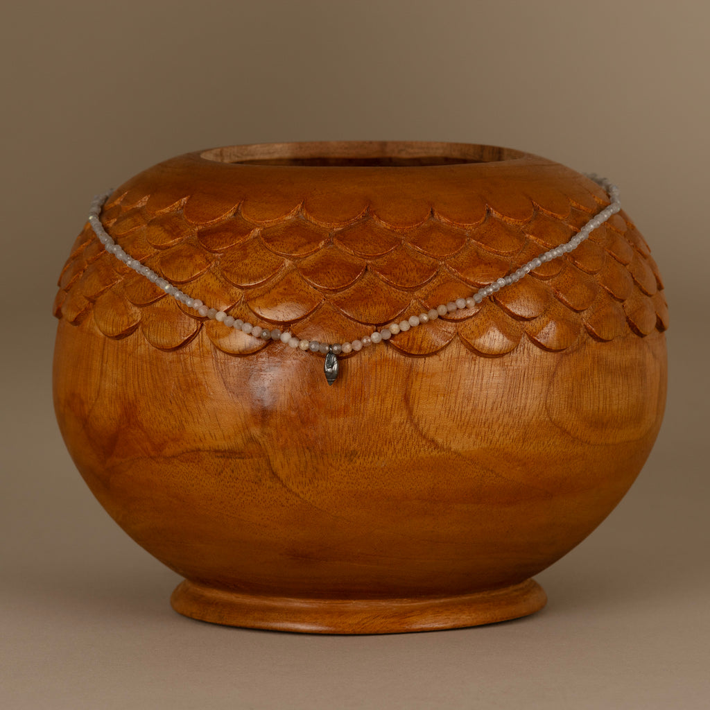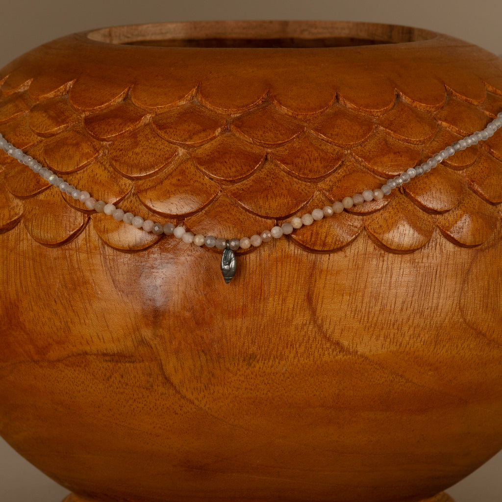 Hand-cast olive shell with gemstone beaded necklace. Olive size approximately 7x3mm. Beads paired with the charm are Sunstone and Labradorite. Length 16.5" with hand-forged simple S-shaped clasp with Coral Bead.