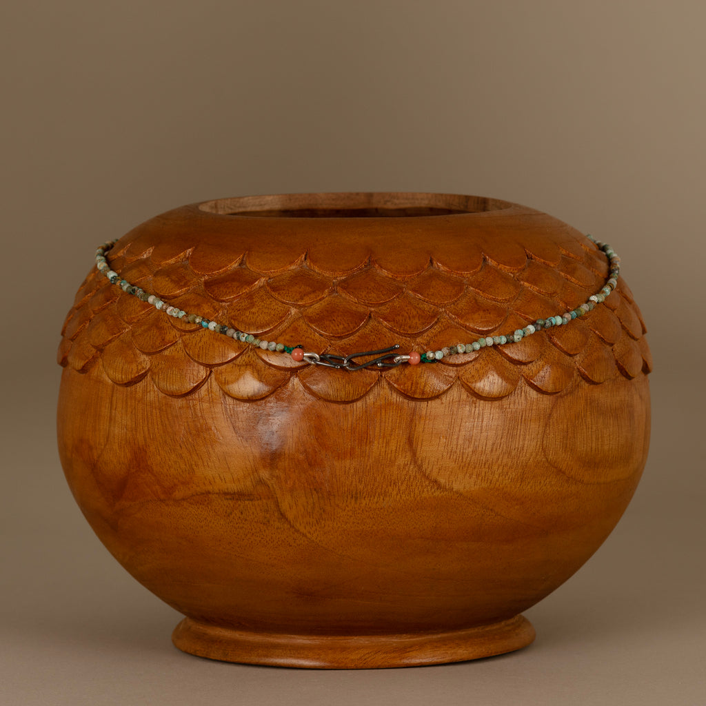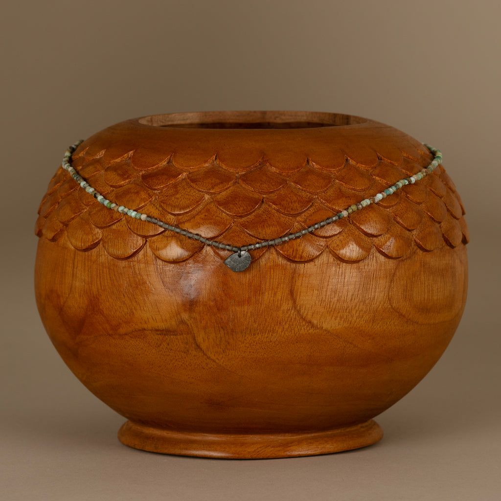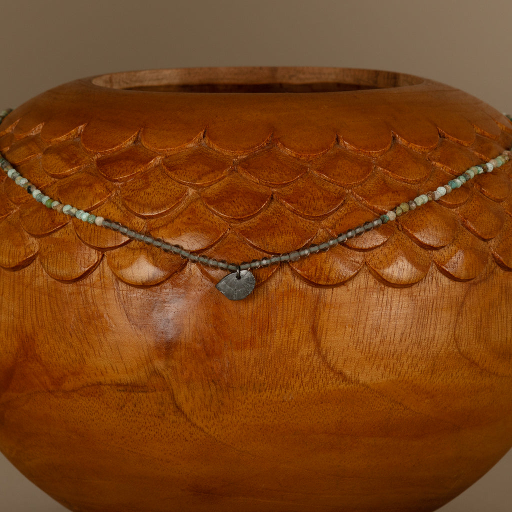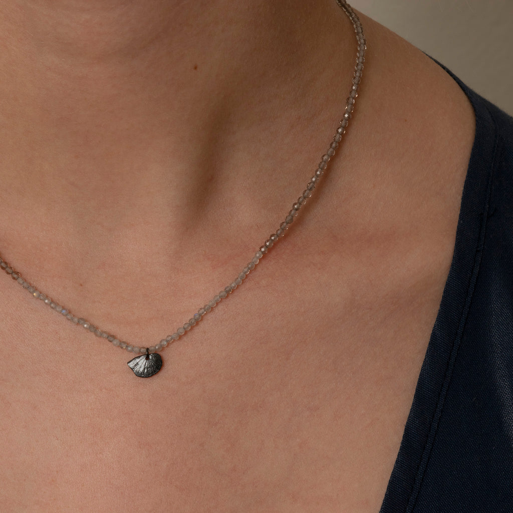 Hand-cast scintilla shell with gemstone beaded necklace. Scintilla shell size approximately 9x6mm. Beads paired with the shell charm are Smoky Quartz and African Turquoise. Length 16.5" with hand-forged simple S-shaped clasp with Coral Bead.