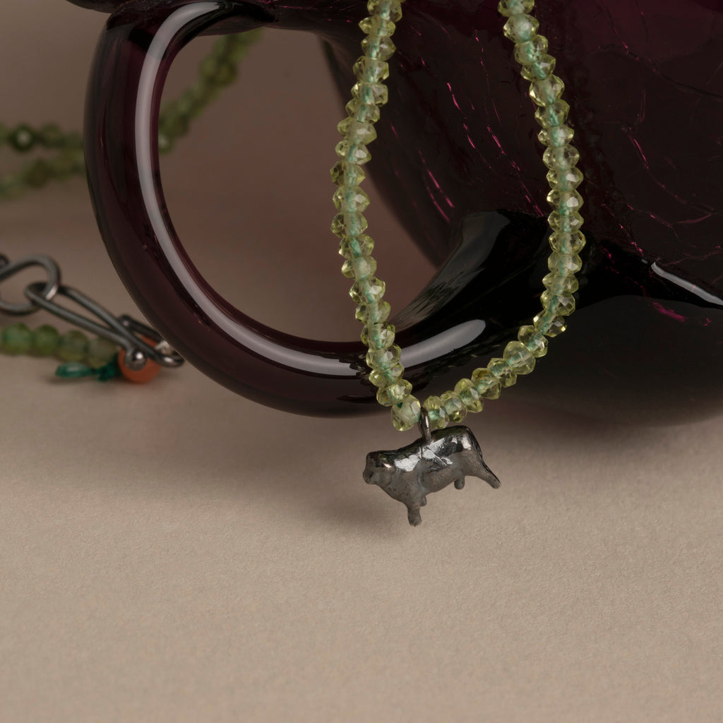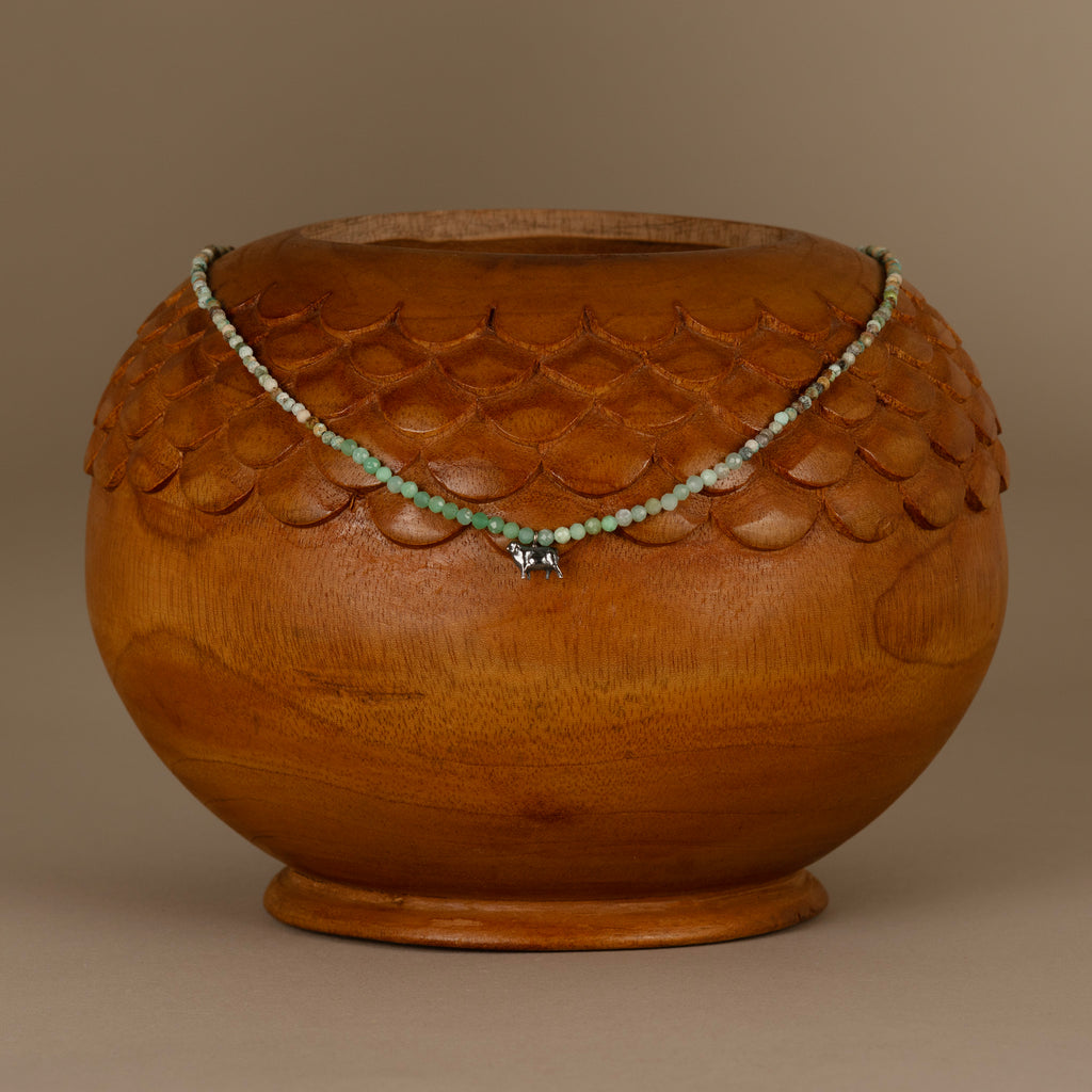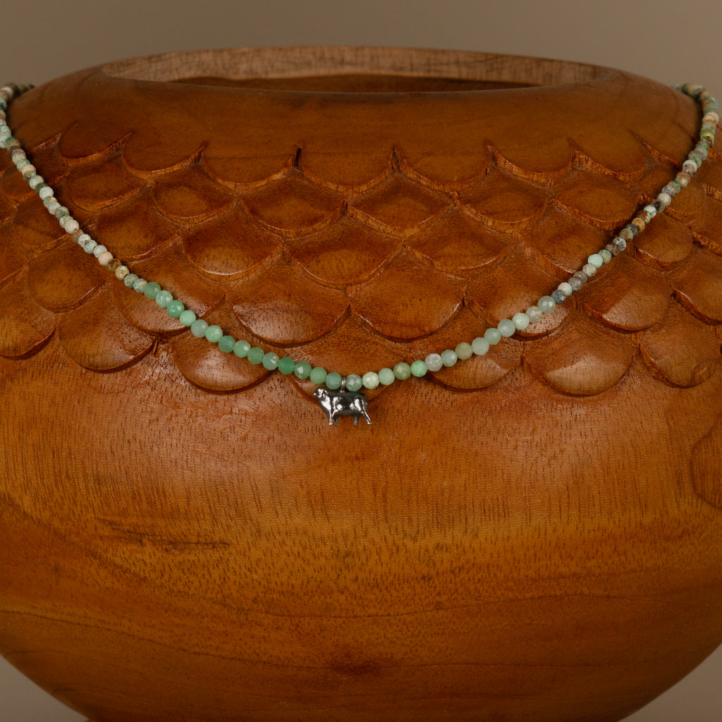 Hand-cast sheep with gemstone beaded necklace. Sheep size approximately 7x6mm. Beads paired with the sheep charm are Chrysoprase and African Turquoise. Length 17" with hand-forged simple S-shaped clasp with Coral Bead.