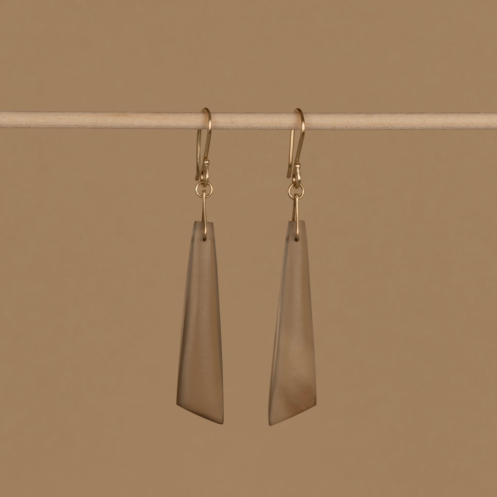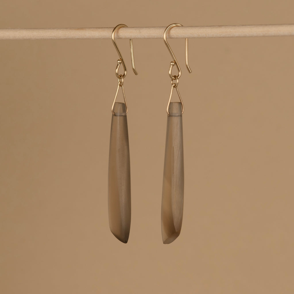 Matte Finish Smoky Lemon Quartz drops, approximate size 40x9mm. I constructed a simple wire bail for the gemstone to hang from the hand-forged ear wire. French style ear wires that I hand-forged. All made in 14KYG. Total length of these earrings 60mm.