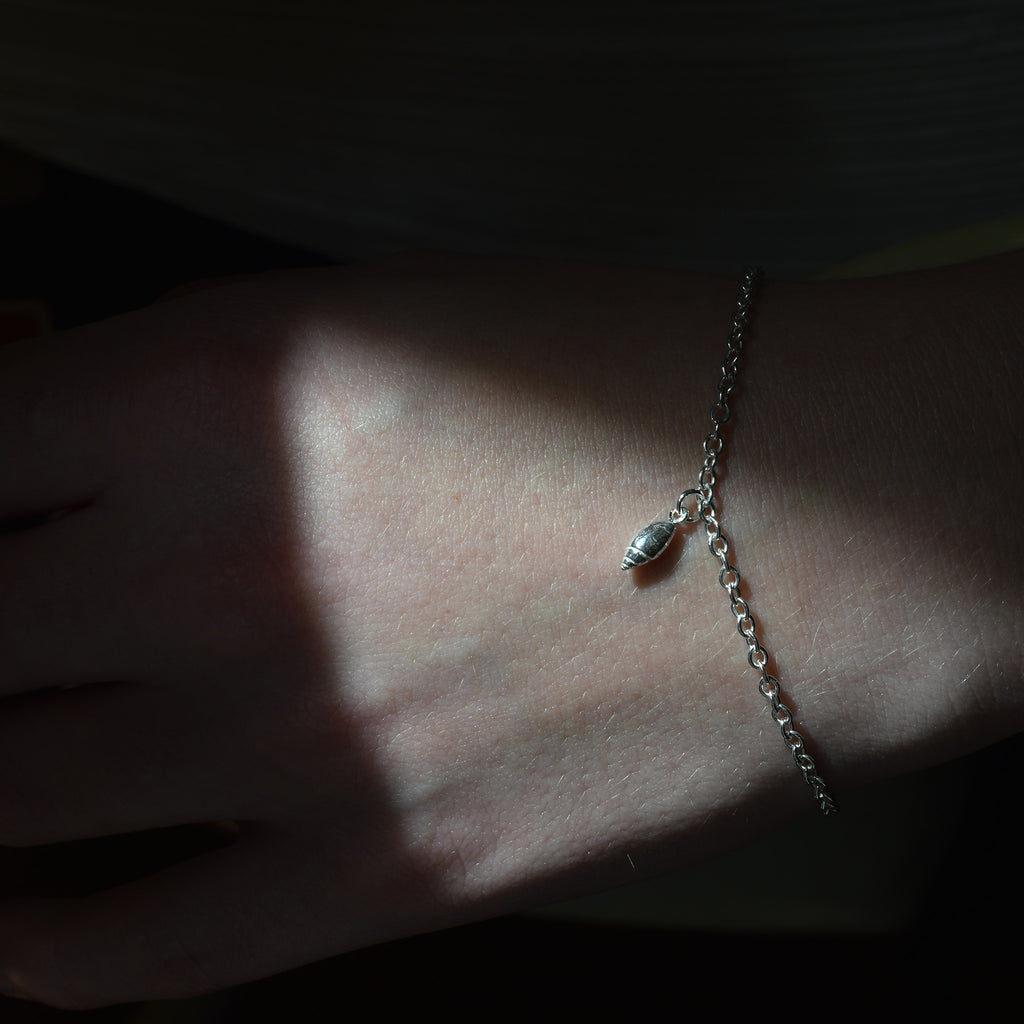 Hand-cast Olive Shell, approximate size 7x3mm attached to a 4mm jump ring. Available in Bright Silver and 14K Yellow Gold. Charm only, bracelet chain not included.
