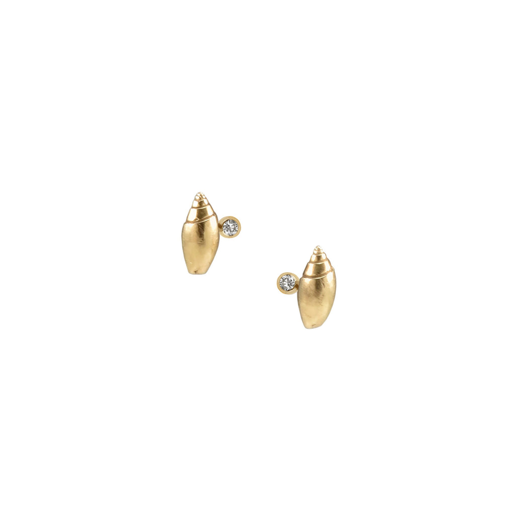 Hand-cast Olive Shell, approximate size 7x3mm with post and ear backs and matching bezel-set melee 1.5mm white diamonds. Available in 14K Yellow, Rose & White Gold.