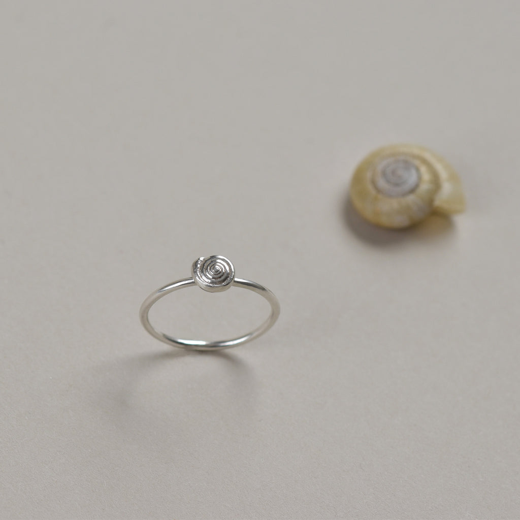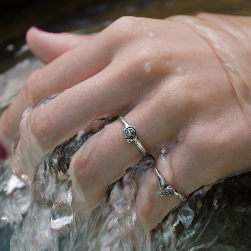 This tiny snail shell has a lovely subtle texture, along the spiral. I made it into a ring that you can wear alone or stack with others.